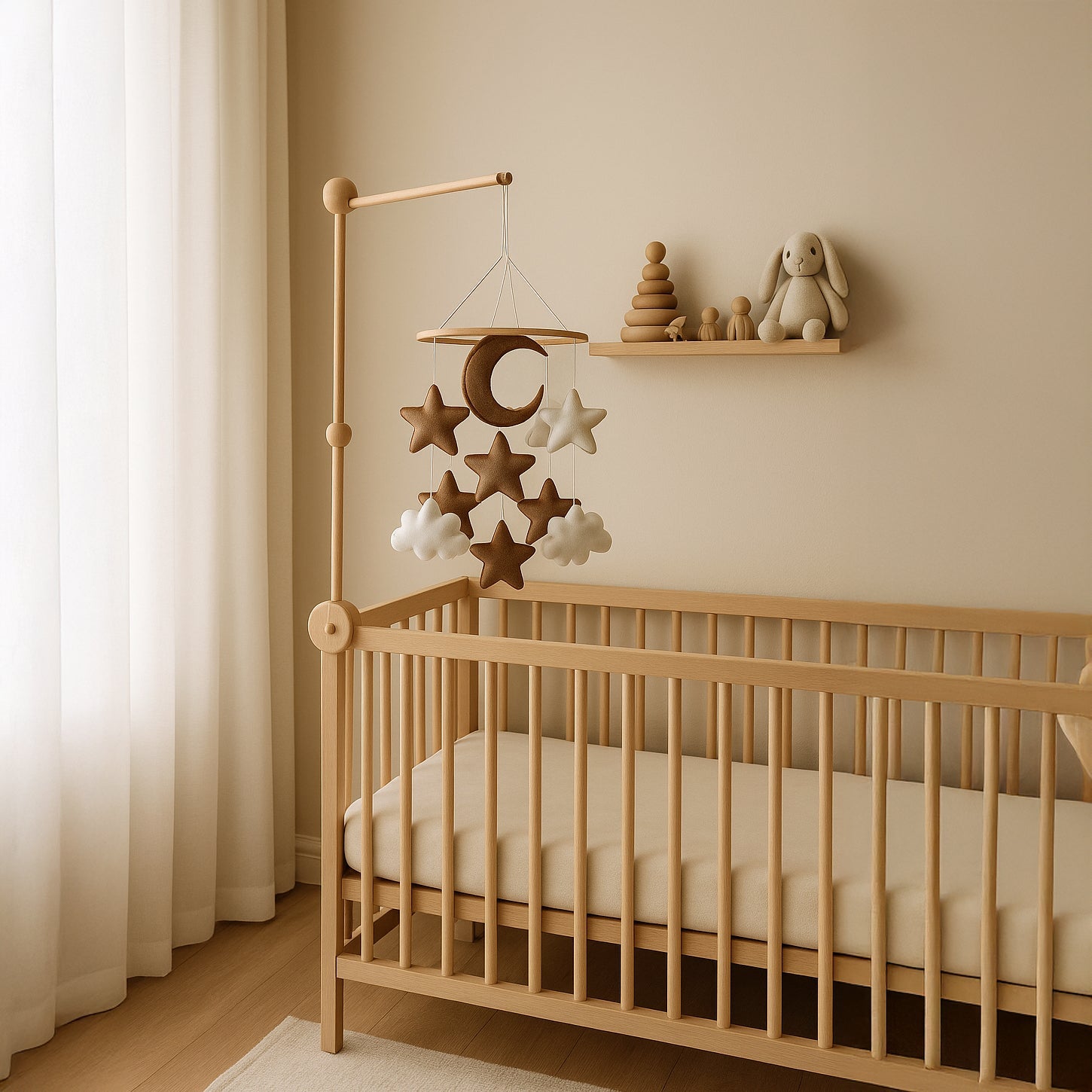 Este móvil de madera y tela es perfecto para la cuna de tu bebé. Con un diseño seguro y resistente, brinda una estimulación visual para el desarrollo sensorial de tu bebé. Disfruta de la tranquilidad y comodidad de ver a tu bebé entretenido con este móvil de cuna.