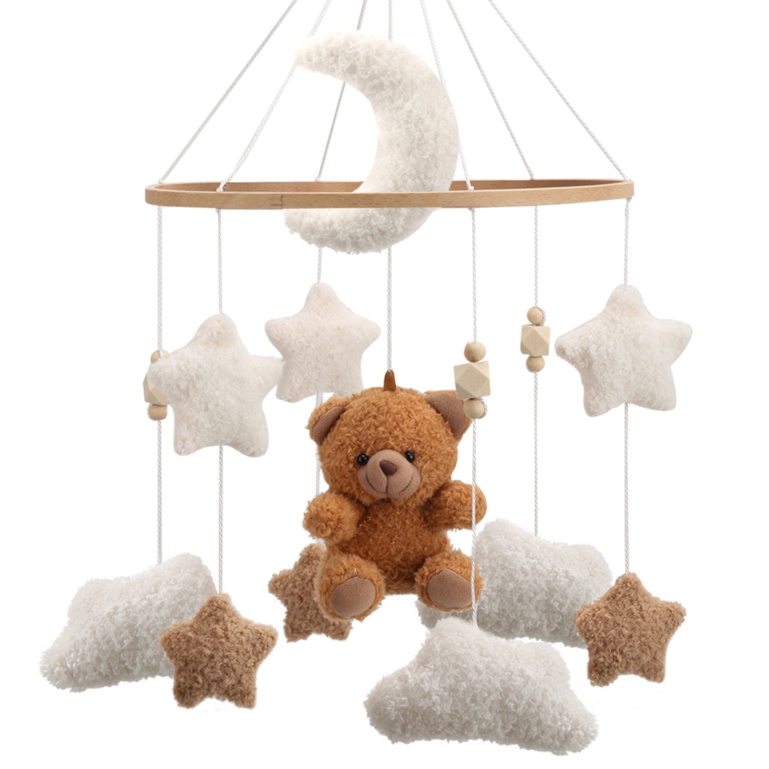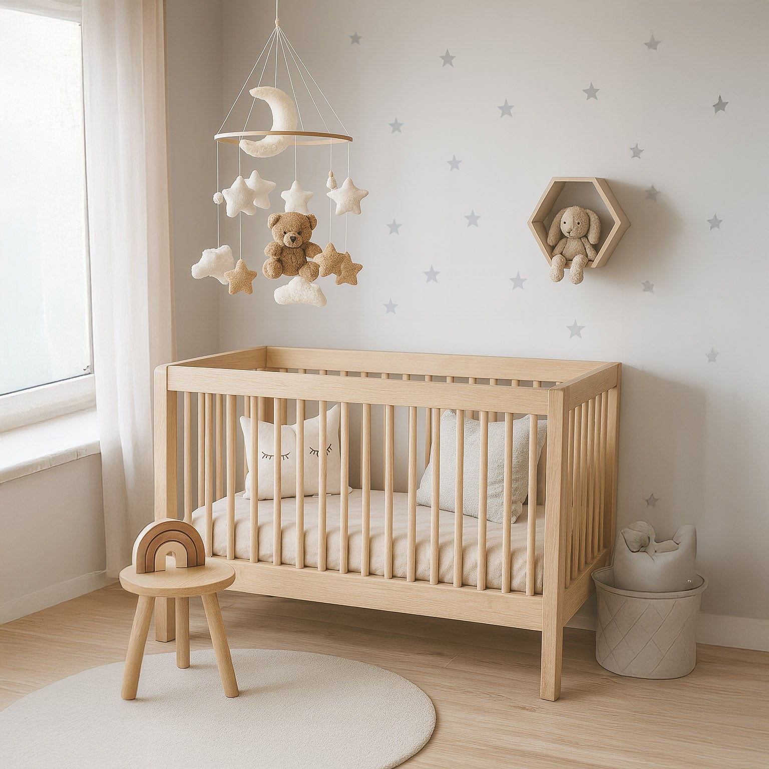 Este móvil de madera y tela es perfecto para la cuna de tu bebé. Con un diseño seguro y resistente, brinda una estimulación visual para el desarrollo sensorial de tu bebé. Disfruta de la tranquilidad y comodidad de ver a tu bebé entretenido con este móvil de cuna.